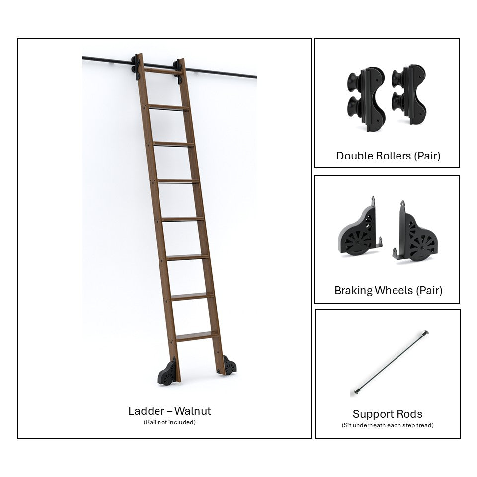Classic | Rolling Ladder Kit | 6-8ft Ladder with Double Rollers and Braking Wheels | Walnut & Black