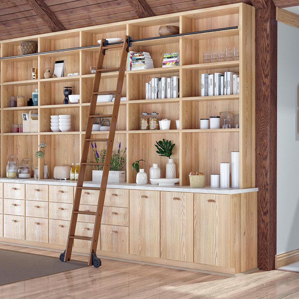 This 6ft to 8ft ladder kit in premium walnut is equipped with a rolling system finished in black. Perfect for cabinetry, libraries, and interior fit-outs, the kit includes all top and bottom hardware needed for a smooth and secure install. Designed to blend craftsmanship with functionality, it's ideal for both modern and traditional interiors.