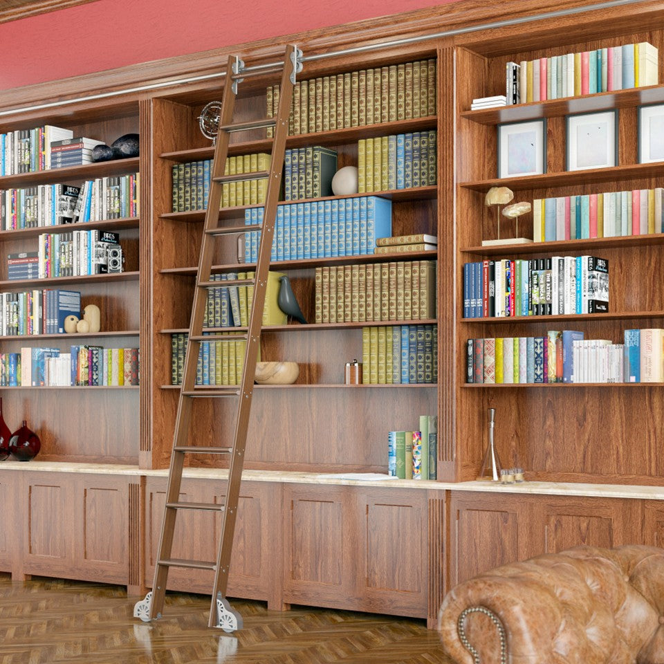 This 6ft to 8ft ladder kit in premium walnut is equipped with a rolling system finished in nickel. Perfect for cabinetry, libraries, and interior fit-outs, the kit includes all top and bottom hardware needed for a smooth and secure install. Designed to blend craftsmanship with functionality, it's ideal for both modern and traditional interiors.