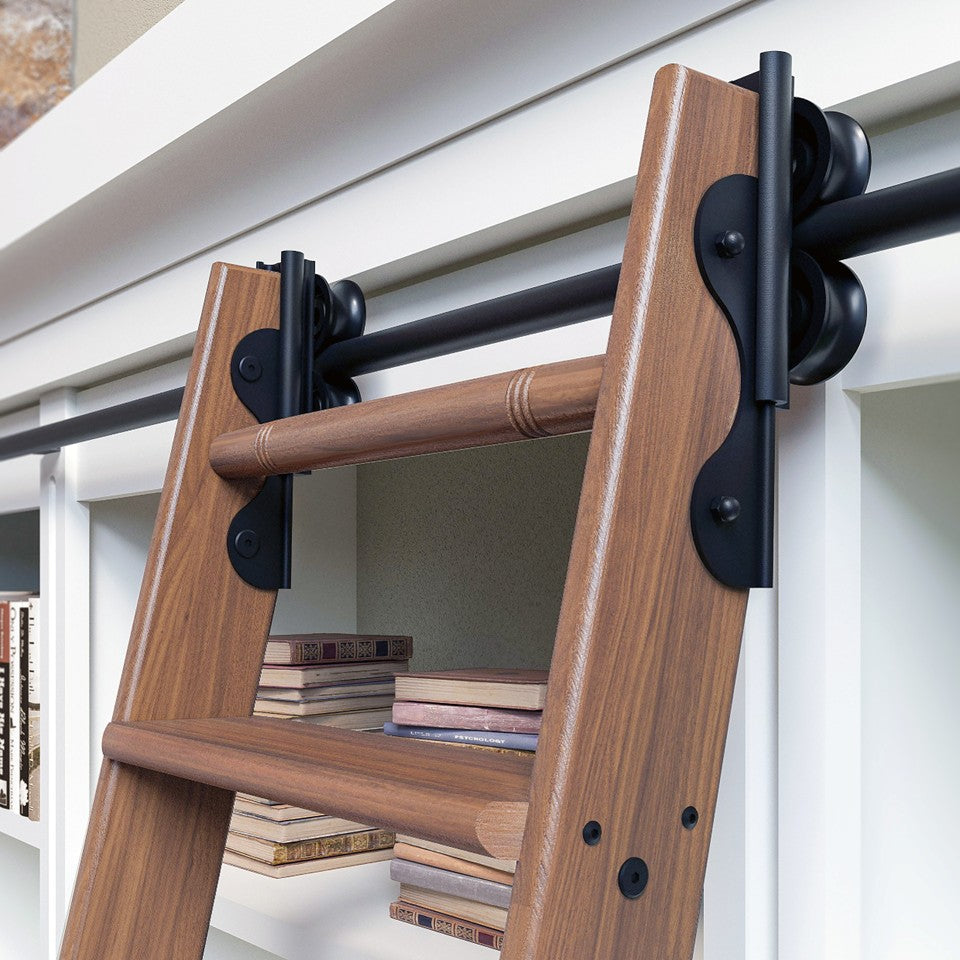 This 7ft ladder kit in premium walnut is equipped with a rolling system finished in black. Perfect for cabinetry, libraries, and interior fit-outs, the kit includes all top and bottom hardware needed for a smooth and secure install. Designed to blend craftsmanship with functionality, it's ideal for both modern and traditional interiors.