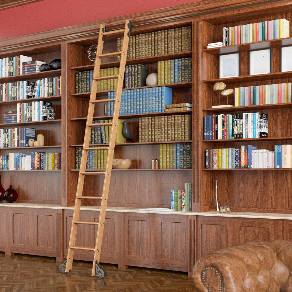 This 9ft ladder kit in premium oak is equipped with a rolling system finished in bronze. Perfect for cabinetry, libraries, and interior fit-outs, the kit includes all top and bottom hardware needed for a smooth and secure install. Designed to blend craftsmanship with functionality, it's ideal for both modern and traditional interiors.