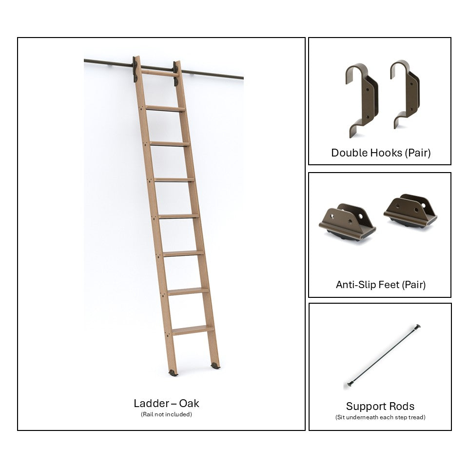 This 9ft ladder kit in premium oak is equipped with a simple hook system finished in bronze. Perfect for cabinetry, libraries, and interior fit-outs, the kit includes all top and bottom hardware needed for a smooth and secure install. Designed to blend craftsmanship with functionality, it's ideal for both modern and traditional interiors.