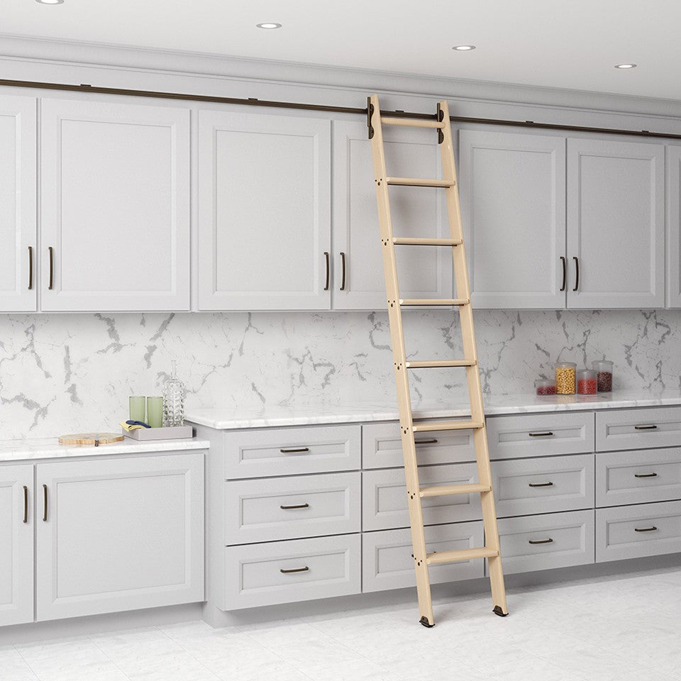 This 6ft to 8ft ladder kit in premium maple is equipped with a sliding hook system finished in bronze. Perfect for cabinetry, libraries, and interior fit-outs, the kit includes all top and bottom hardware needed for a smooth and secure install. Designed to blend craftsmanship with functionality, it's ideal for both modern and traditional interiors.