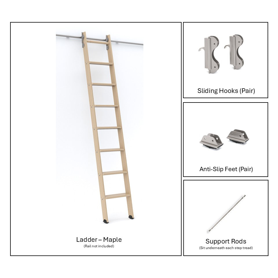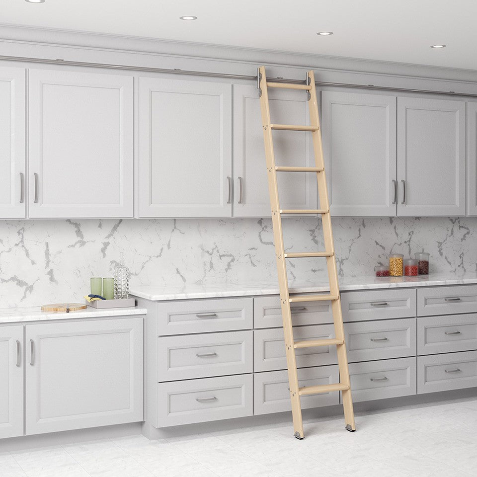 This 6ft to 8ft ladder kit in premium maple is equipped with a sliding hook system finished in nickel. Perfect for cabinetry, libraries, and interior fit-outs, the kit includes all top and bottom hardware needed for a smooth and secure install. Designed to blend craftsmanship with functionality, it's ideal for both modern and traditional interiors.