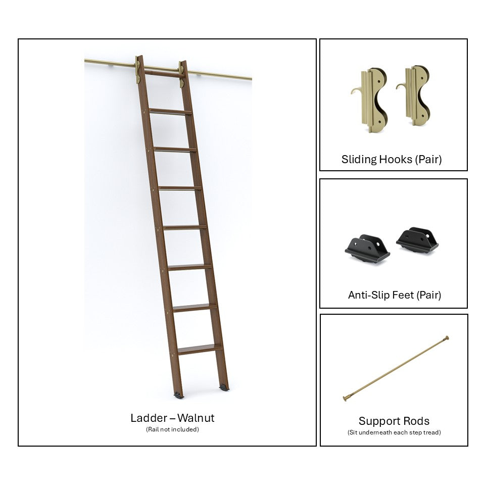 This 8ft ladder kit in premium walnut is equipped with a sliding hook system finished in brass. Perfect for cabinetry, libraries, and interior fit-outs, the kit includes all top and bottom hardware needed for a smooth and secure install. Designed to blend craftsmanship with functionality, it's ideal for both modern and traditional interiors.