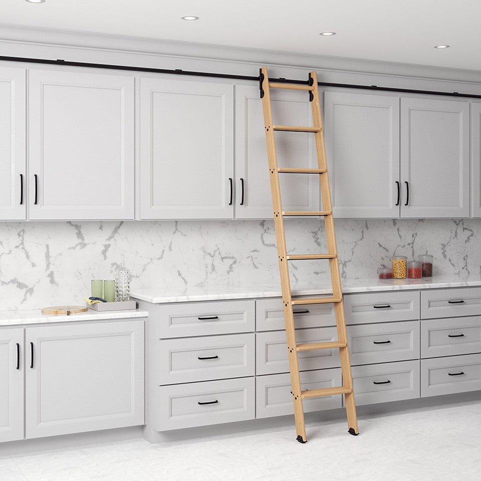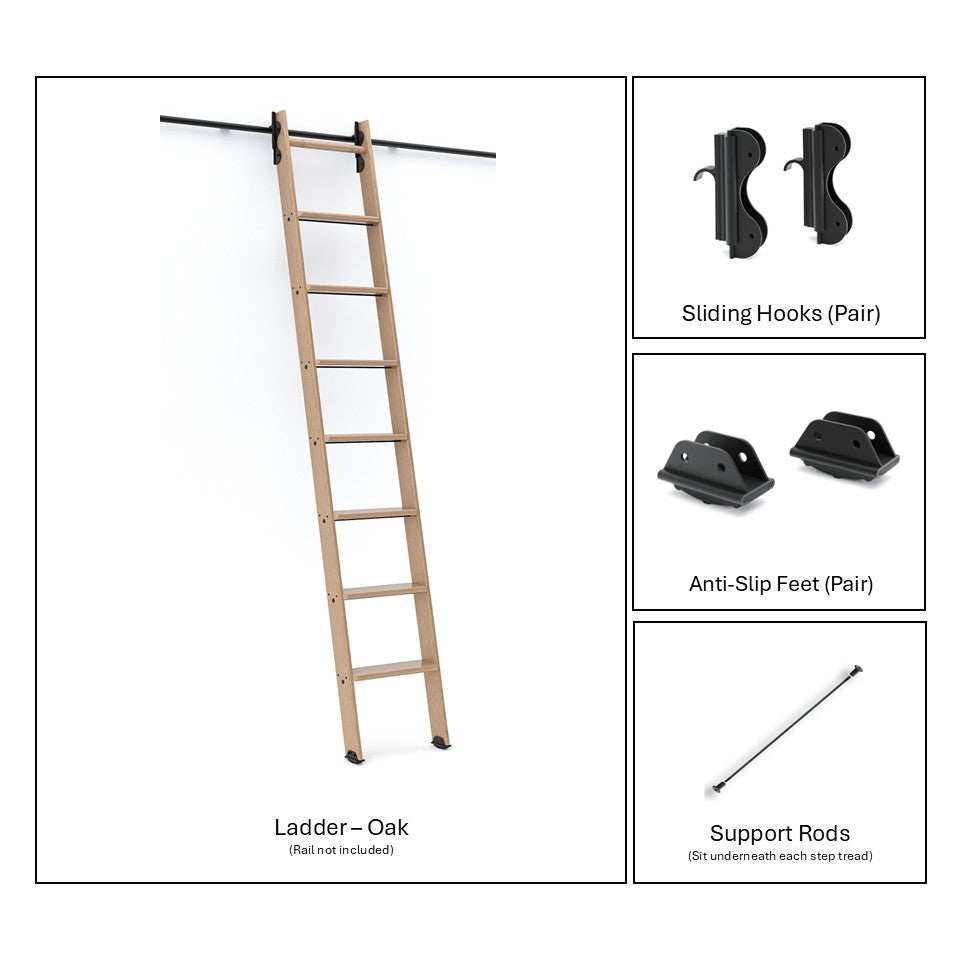 This 9ft ladder kit in premium oak is equipped with a sliding hook system finished in black. Perfect for cabinetry, libraries, and interior fit-outs, the kit includes all top and bottom hardware needed for a smooth and secure install. Designed to blend craftsmanship with functionality, it's ideal for both modern and traditional interiors.