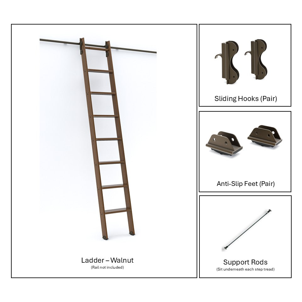 This 9ft ladder kit in premium walnut is equipped with a sliding hook system finished in bronze. Perfect for cabinetry, libraries, and interior fit-outs, the kit includes all top and bottom hardware needed for a smooth and secure install. Designed to blend craftsmanship with functionality, it's ideal for both modern and traditional interiors.