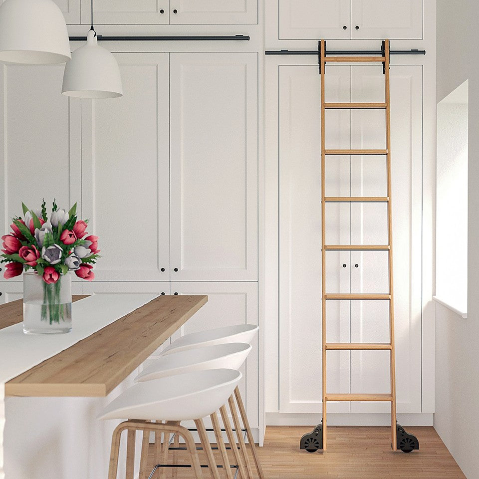This 7ft ladder kit in premium oak is equipped with a lift off rolling system finished in black. Perfect for cabinetry, libraries, and interior fit-outs, the kit includes all top and bottom hardware needed for a smooth and secure install. Designed to blend craftsmanship with functionality, it's ideal for both modern and traditional interiors.