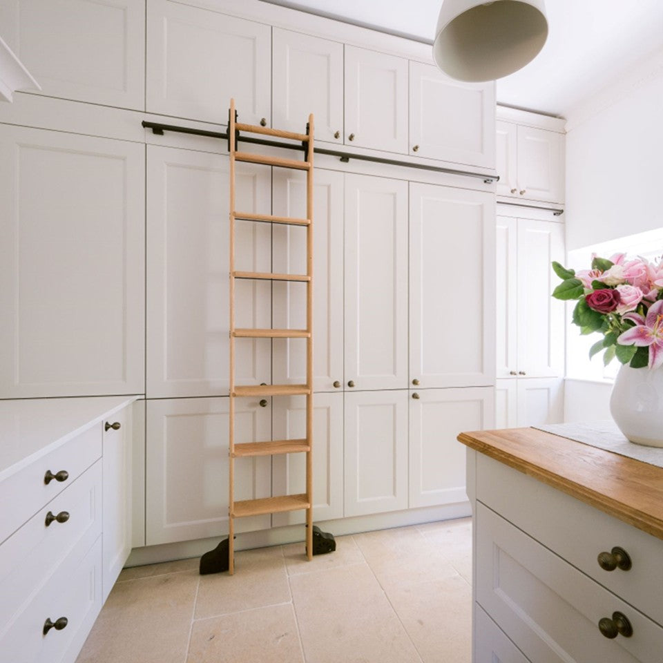 "The ladder is extremely well made, feels sturdy, and gives the client great confidence when climbing high up to top shelves. The wide assortment of fixings and fittings make the system extremely versatile to fit all shapes and sizes of room."