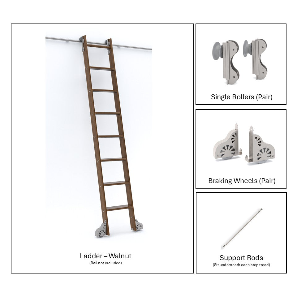 Highgrove | Lift Off Rolling Ladder Kit | 7ft Ladder with Single Rollers and Braking Wheels | Walnut & Nickel