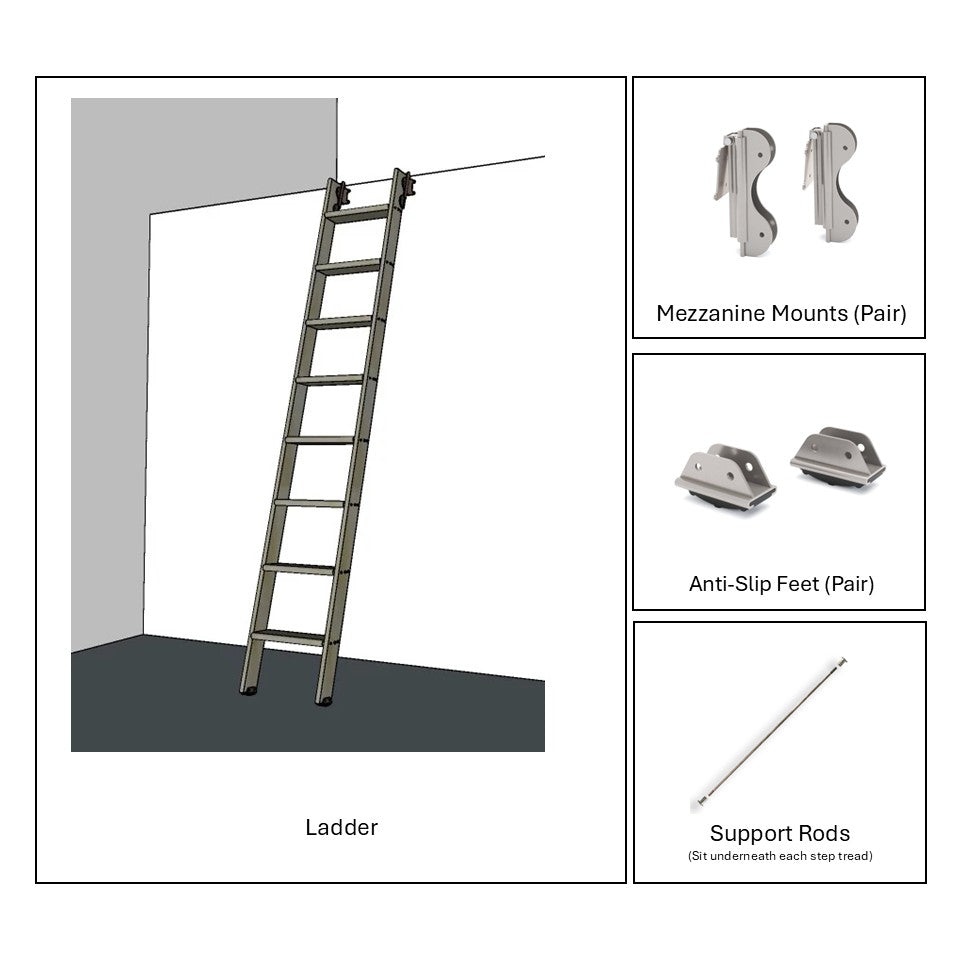 - 2x Mezzanine Mounts, 2x Anti-slip Feet and ladder fixings